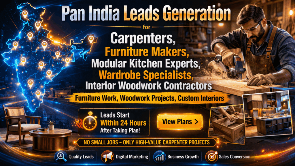 Carpenter, Interior Designer, Furniture Maker, Contractor aur Modular Kitchen Specialist ke liye special lead plan. Ab calls aur WhatsApp messages seedha aapke number par.